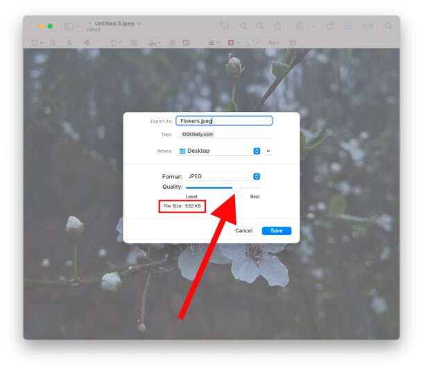 В моём примере несжатый файл цветка на 8 МБ после конвертации в JPEG стал весить 1,6 МБ, а после регулировки ползунка — всего 532 КБ.