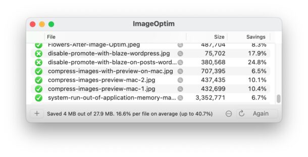 ImageOptim работает быстро с большинством форматов, хотя JPEG, например, обрабатывает быстрее, чем PNG.