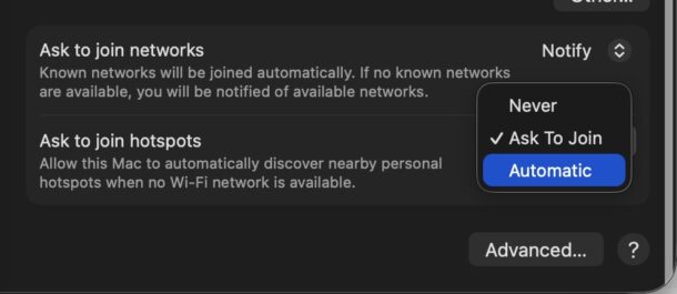 Перейдите в Системные настройки > Wi-Fi > прокрутите до самого низа до пункта «Предлагать подключиться к точкам доступа» > установите «Автоматически».