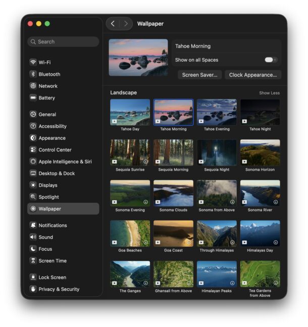 macOS Tahoe включает новые красивые обои и заставки, в том числе виды озера Тахо, потрясающие пейзажи пляжей Гоа в Индии, чайные плантации, полеты над Гималаями и путешествия по верховьям реки Ганг.