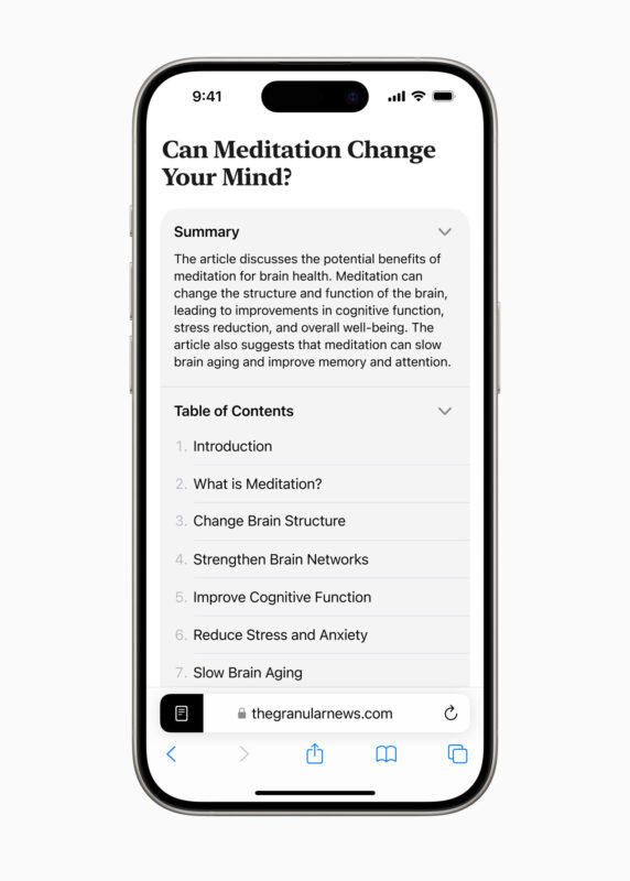 В Safari появились удобные AI-фичи. Например, можно быстро получить краткое содержание веб-страницы.