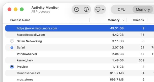 На скриншоте ниже видно, как две вкладки Safari, оставленные на ночь, раздулись до невероятных размеров, превысив объем физической оперативной памяти. После пробуждения Mac еле шевелился, и убийство этих двух процессов Safari мгновенно всё исправило (правда, если оставить вкладки открытыми надолго, проблема быстро возвращается).