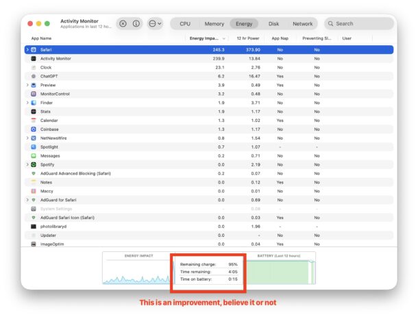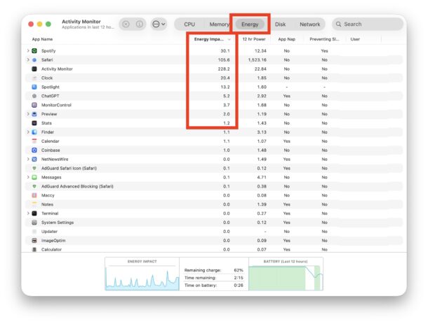 Откройте «Мониторинг системы» (через Spotlight или в /Программы/Утилиты/), перейдите на вкладку «Энергия» и отсортируйте список по столбцу «Влияние на энергопотребление».