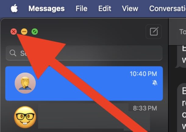 - Нажмите на зеленую кнопку закрытия окна, чтобы закрыть все окна «Сообщений». Само приложение останется открытым, просто исчезнут его окна (все чаты и переписки никуда не денутся, не переживайте).