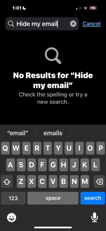 Может, это баг, а может, так задумано. Но в любом случае не стоит полагаться только на поиск, чтобы найти что-то в настройках iPhone или iPad, и уж тем более саму функцию «Скрыть мою электронную почту».