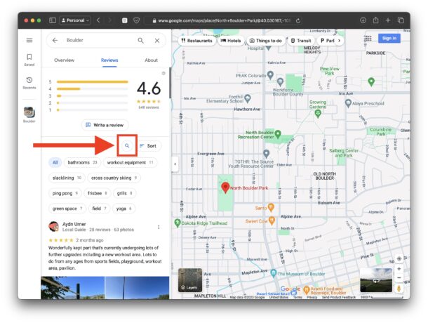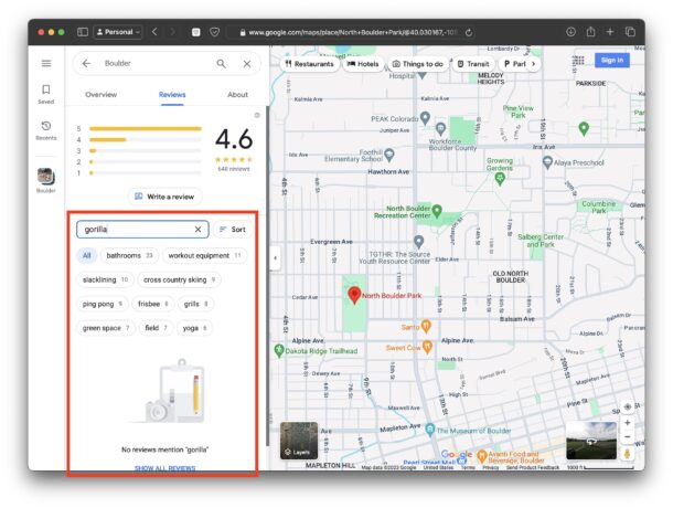 На скриншоте, например, мы ищем в отзывах о парке в Боулдере слово "горилла". Мало ли, вдруг там разгуливает сбежавшая обезьяна, а нам такое приключение не нужно.