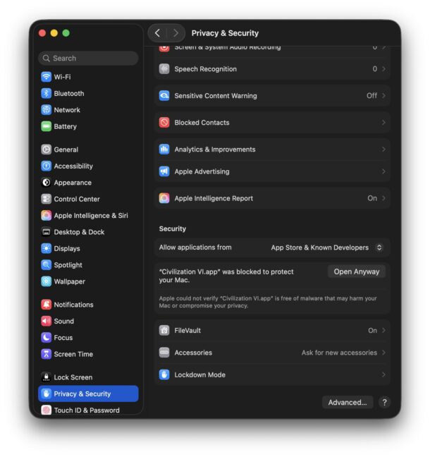 - В Системных настройках перейдите в «Конфиденциальность и безопасность» и прокрутите вниз, пока не увидите текст «Приложение “Civilization VI.app” было заблокировано для защиты вашего Mac». Нажмите «Все равно открыть»