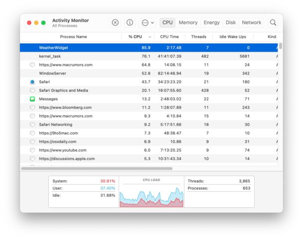 Я недавно снова это заметил благодаря Stats - моему любимому приложению для менюбара, которое показывает статистику системы. Увидел просадку производительности и высокую нагрузку на ЦП в Stats, потом открыл «Мониторинг системы» и нашел виновника. Простое завершение процесса WeatherWidget заставило его перезапуститься, и все пришло в норму.