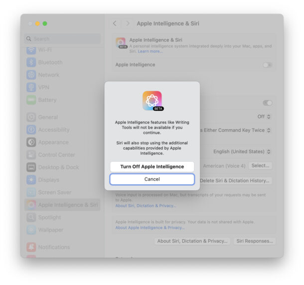Функция отключится сразу, и все AI-инструменты на Mac перестанут работать.