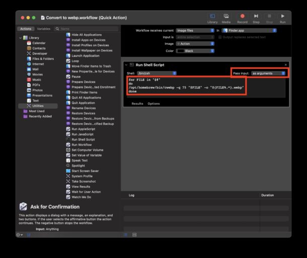 - В действии «Run Shell Script» найдите опцию «Pass input» и выберите «as arguments».