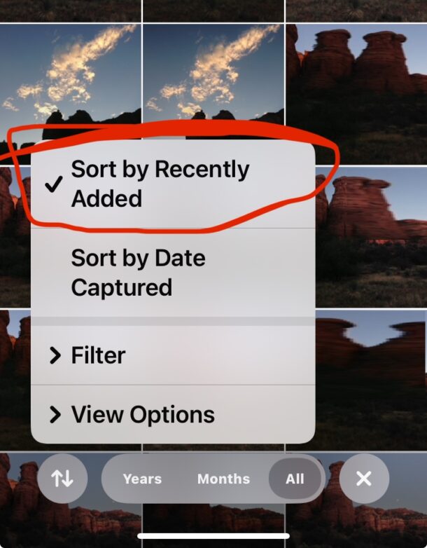 - Нажмите на появившуюся кнопку и выберите "Сортировать по дате добавления". Теперь все недавно сохраненные, сброшенные через AirDrop или добавленные фото и видео будут появляться внизу ленты, как мы и привыкли.