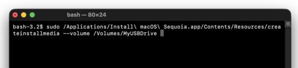 sudo /Applications/Install\ macOS\ Sequoia.app/Contents/Resources/createinstallmedia --volume /Volumes/MyUSBDrive