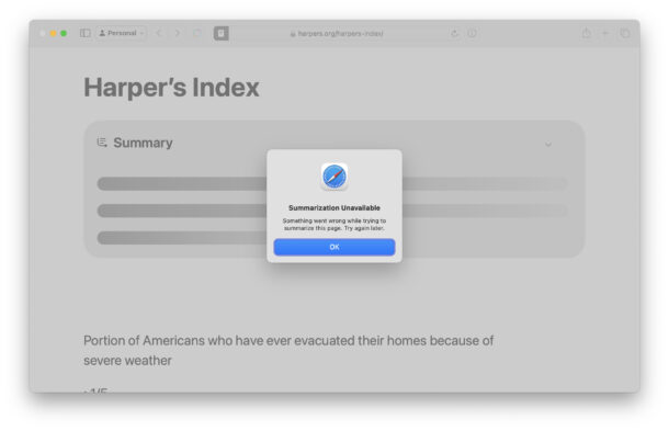 Как и многие AI-функции, Apple Intelligence Summarize срабатывает не в 100% случаев. Иногда процесс может завершиться ошибкой, и вместо сводки вы увидите сообщение: «Суммирование недоступно. При попытке суммировать эту страницу произошла ошибка. Повторите попытку позже.»