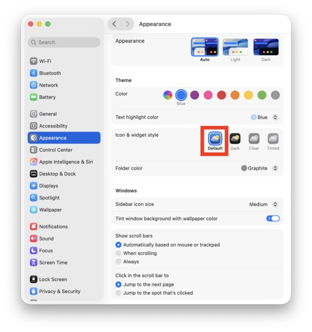 - Теперь идите в Системные настройки > Внешний вид и в разделе «Значки и виджеты» выберите «По умолчанию».