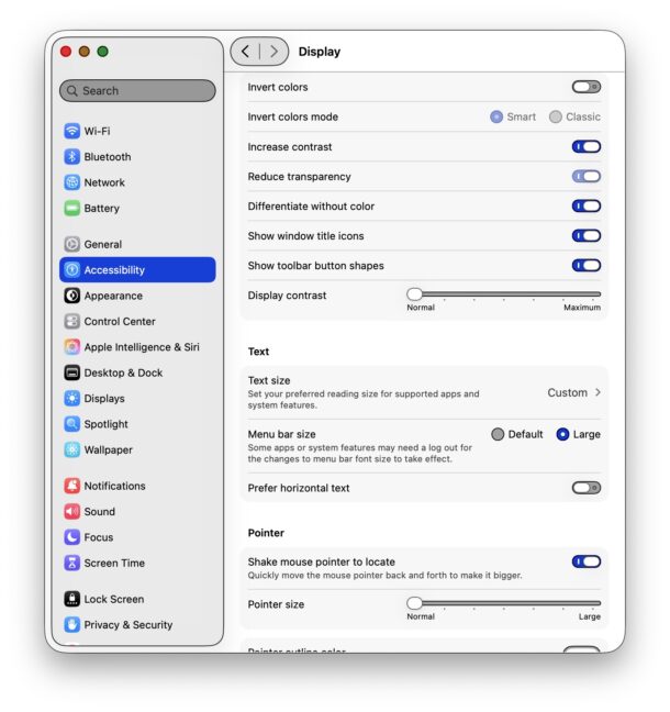 Если предыдущих настроек мало и вокруг всё ещё слишком много теней, прозрачностей, полупрозрачностей и странных цветовых сочетаний с плохим контрастом, есть ещё один вариант - «Увеличить контраст». Найдите эту настройку в Системных настройках > Универсальный доступ > Дисплей. Она уберёт остатки Liquid Glass практически полностью. Но, как вы сразу увидите, эффект получается очень радикальным. Интерфейс становится каким-то непривычным, местами похожим на детский рисунок, и многим пользователям это точно не понравится. Идеально было бы, если бы интенсивность этой настройки можно было регулировать ползунком, но это, скорее всего, лишь мечты.