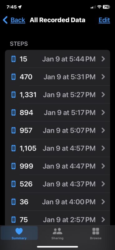 - Здесь вы увидите все записи о шагах. Самая верхняя - самая свежая. Она обновляется часто, но для реального времени нажмите на неё
