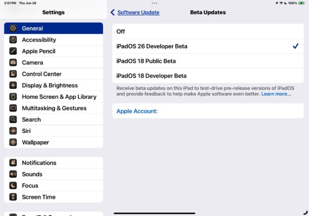 Обновления для iPadOS 26 beta будут приходить через «Обновление ПО», и