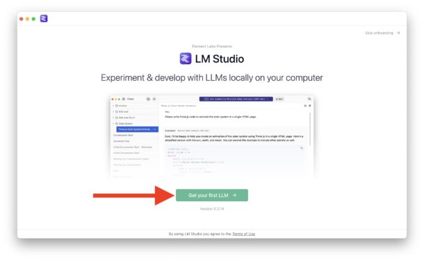 - При первом запуске вы увидите стартовый экран. Нажмите на зелёную кнопку «Get your first LLM».