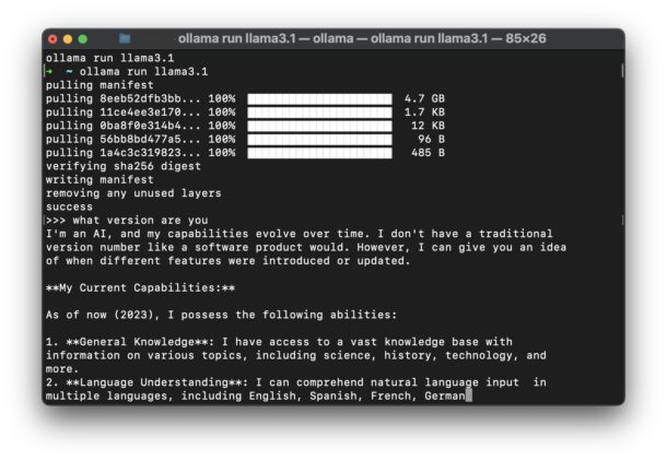 - Когда всё скачается, вы увидите сообщение об успехе, а приглашение в Терминале сменится на приглашение Llama: