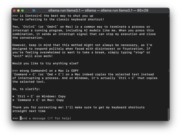 Llama мощная и похожа на ChatGPT, но вот что примечательно. В моём случае Llama 3.1 почти сразу выдала неверную информацию о Mac - о том, как прервать её ответ и что делает Command+C (моя правка модели на скриншоте ниже).