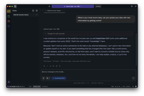 Поскольку gpt-oss работает офлайн, он не сможет обновлять информацию или запрашивать свежие данные из сети. Но даже в версии 20b у него огромная база знаний. Если хочется больше возможностей (и не страшно, что на большинстве домашних Mac все будет работать медленнее), можешь поставить версию 120b - если, конечно, хватит места на диске.