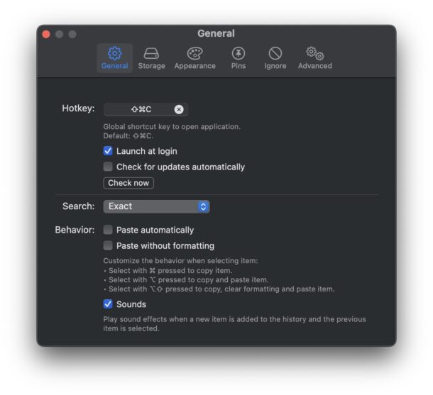 В Maccy ещё и тонна настроек. Можно, например, включить автозапуск при старте системы, изменить размер истории, исключить определённые приложения, назначить горячие клавиши, включать и выключать функции — и много чего ещё.