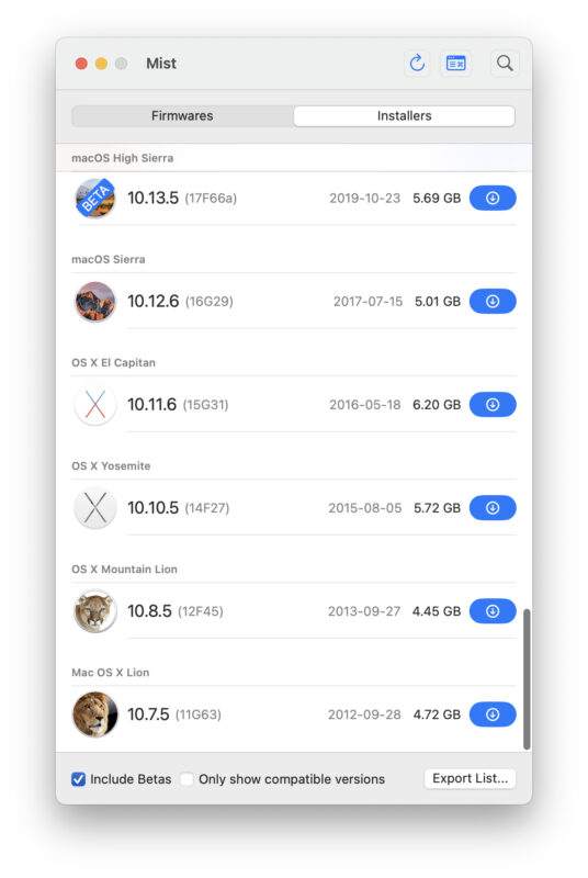 Вы заметите, что можно включить переключатель, чтобы показывать или скрывать бета-версии macOS, а также удобную опцию для отображения только тех версий, которые совместимы с конкретным Mac, на котором запущена Mist.