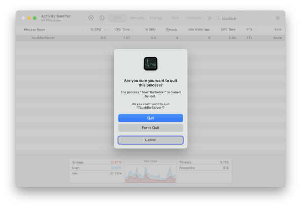 Сделать это можно в "Мониторинге системы", найдя процесс "TouchBarServer" и завершив его. Или через "Терминал", введя команду "sudo killall TouchBarServer".