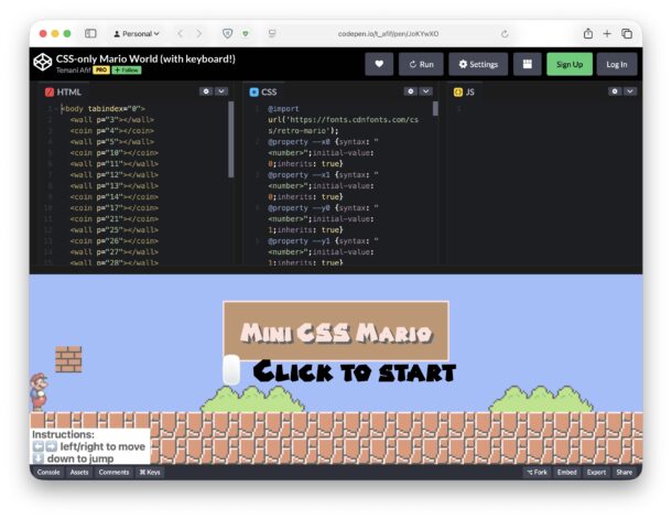 Можете сразу перейти по первой ссылке и поиграть. А если вам ближе код, то вторая ссылка откроет встроенный в браузер редактор со всей HTML-разметкой и CSS-стилями игры. Там можно поковыряться, что-то поменять и посмотреть, что получится.
