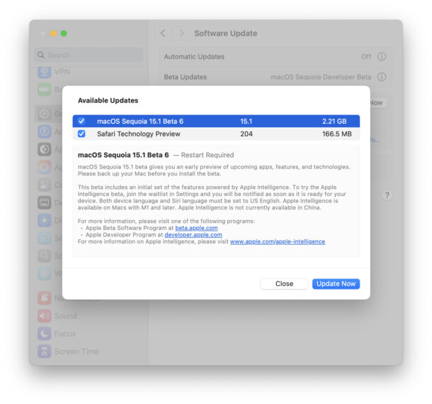 - Нажмите «Обновить сейчас», чтобы начать установку macOS Sequoia 15.1 beta 7.