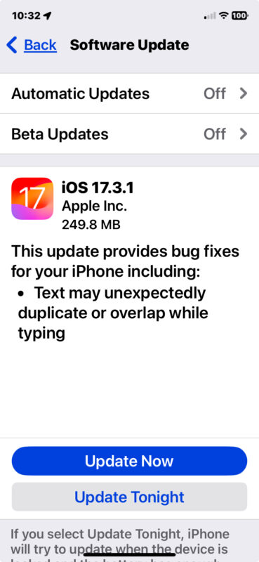 - Тапните «Обновить сейчас» для iOS 17.3.1 / iPadOS 17.3.1, чтобы начать загрузку и установку