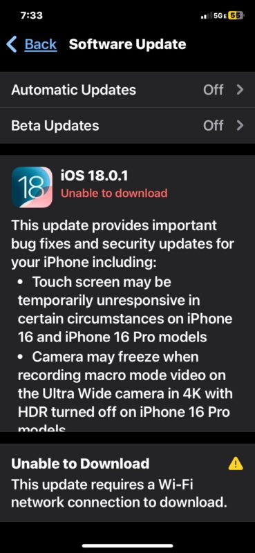 Обновление довольно маленькое, так что загрузка и установка iOS 18.0.1 или iPadOS 18.0.1 не должны занять много времени.