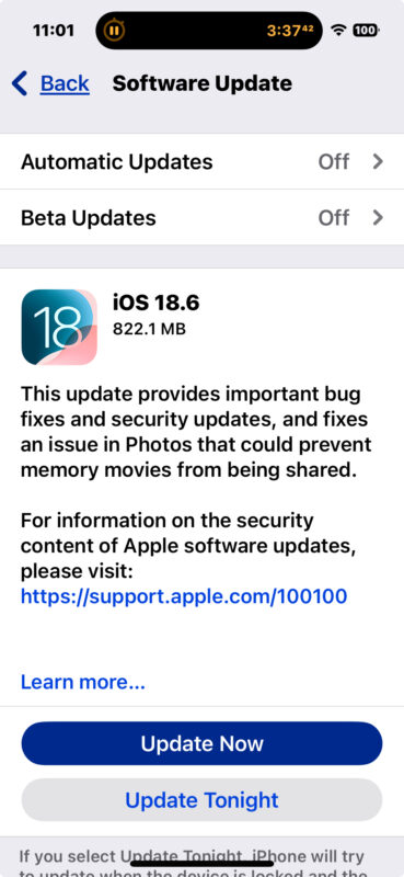 - Нажмите "Обновить сейчас", чтобы скачать и установить iOS 18.6 / iPadOS 18.6, когда оно появится в списке.
