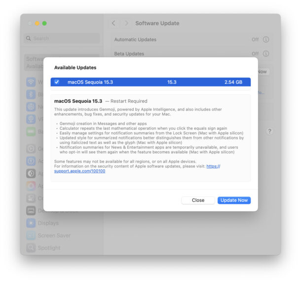 Это обновление представляет Genmoji на базе Apple Intelligence, а также включает другие улучшения, исправления ошибок и обновления безопасности для вашего Mac.