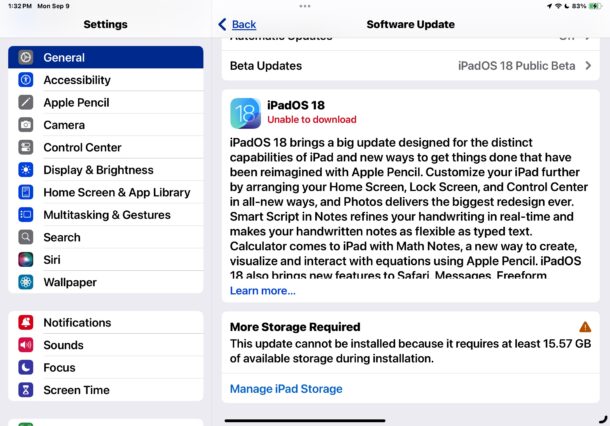 If you have a 64GB device, like many iPads are iPhones, you might be stuck in the dreaded update purgatory situation where you have insufficiently available disk space to install the update, despite having all the optimization settings turned on like offloading apps, iCloud, and iCloud Photos, and thus be unable to install the update. That it’s iOS 18 and this is still happening is kind of amazing, but maybe everyone who works for Apple has a 1TB device and never experiences the endless storage hassles. So, be ready to delete a bunch of stuff manually, yet again.
