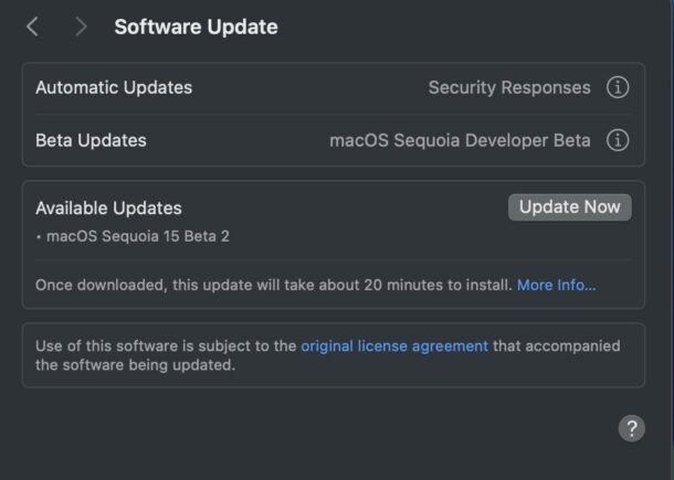 - Нажмите «Обновить сейчас» для macOS Sequoia 15 developer beta 2, чтобы начать загрузку и установку.