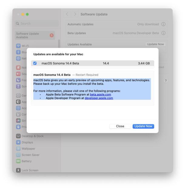 Если вы участвуете в программе тестирования macOS Sonoma, найти обновление до версии 14.4 beta 1 можно в «Системных настройках» > «Основные» > «Обновление ПО».