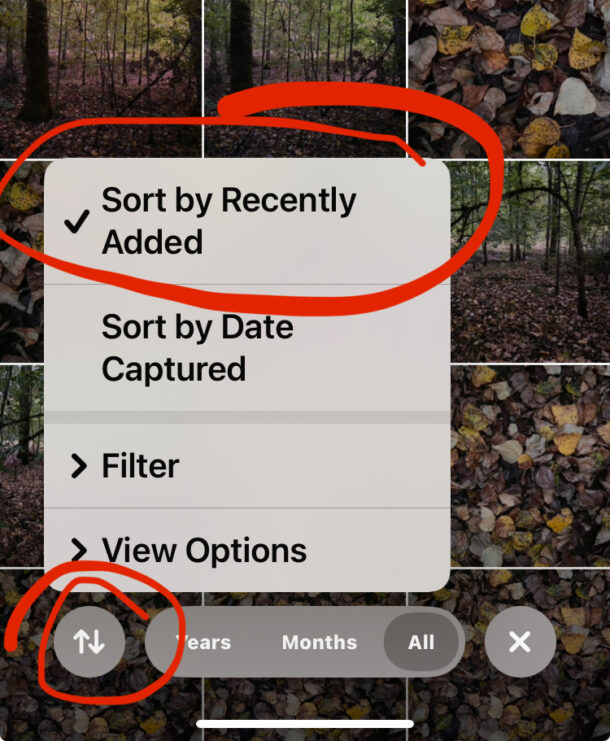 Чтобы это изменить, откройте "Фото", немного прокрутите ленту вверх - появится загадочная кнопка с двумя стрелками в разные стороны. Нажмите на нее и выберите "Сортировать по дате добавления".