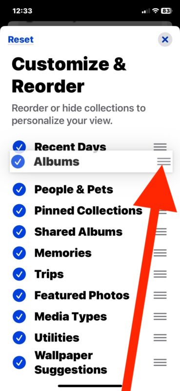 - На экране настроек можно убрать синие галочки с коллекций, которые хотите скрыть, а также зажать и перетащить любую коллекцию, чтобы изменить её положение. Многим помогает переместить раздел «Альбомы» наверх, вместе с другими часто используемыми коллекциями.
