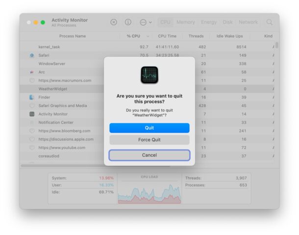 Я недавно снова это заметил благодаря Stats - моему любимому приложению для менюбара, которое показывает статистику системы. Увидел просадку производительности и высокую нагрузку на ЦП в Stats, потом открыл «Мониторинг системы» и нашел виновника. Простое завершение процесса WeatherWidget заставило его перезапуститься, и все пришло в норму.