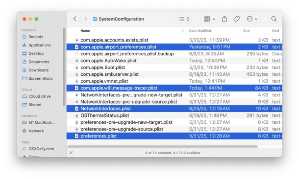 - Нажмите Return, чтобы перейти в папку SystemConfiguration. Найдите и переместите следующие файлы на рабочий стол Mac (это послужит их резервной копией; если что, вы всегда сможете вернуть их обратно, перетащив в ту же папку):