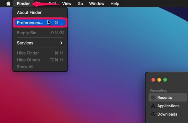 - Убедитесь, что окно Finder активно, и в верхней строке меню нажмите Finder -> Настройки, как показано ниже.