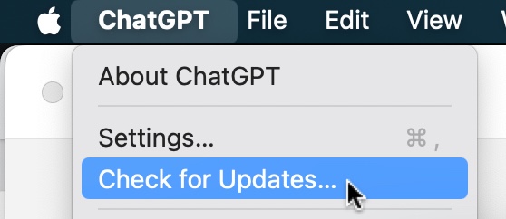 - В строке меню нажмите «ChatGPT» и выберите «Check for Updates» (Проверить обновления).