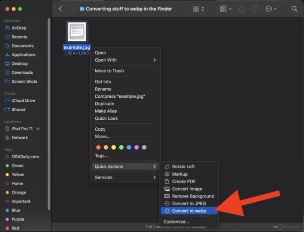 - Перейдите в Finder на Mac, найдите любой файл изображения или группу файлов, щёлкните правой кнопкой мыши и выберите «Convert to WebP».