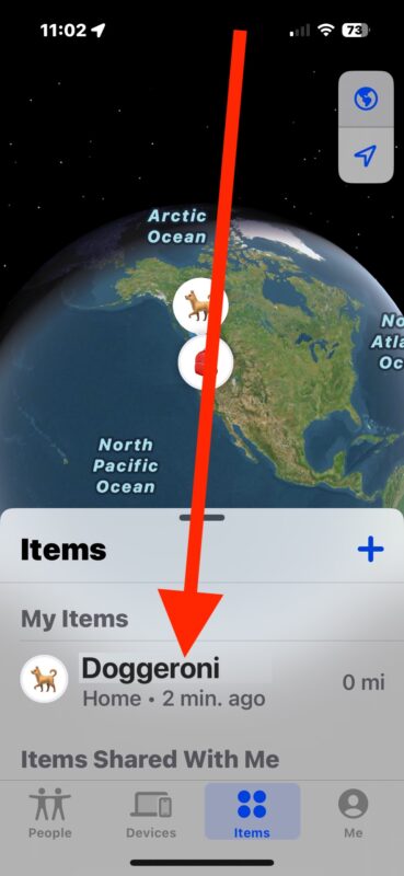- Перейдите в раздел «Предметы» и нажмите на название нужного AirTag (или предмета).