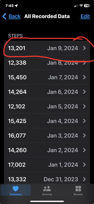 - Здесь вы увидите все записи о шагах. Самая верхняя - самая свежая. Она обновляется часто, но для реального времени нажмите на неё