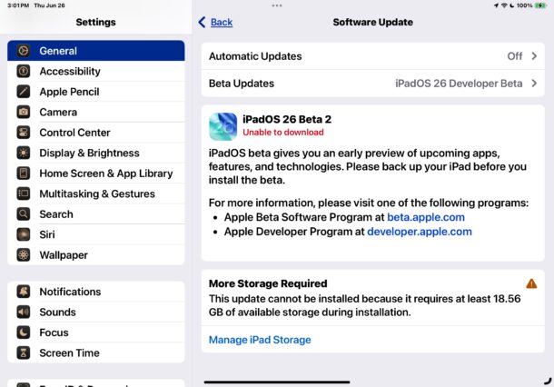 Обновления для iPadOS 26 beta будут приходить через «Обновление ПО», и