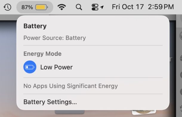 Значок батареи на Mac в целом очень полезен (его можно включить в настройках Пункта управления, хотя по умолчанию он должен быть активен на всех ноутбуках). Он не только позволяет следить за зарядом, но и даёт быстрый доступ к режиму энергосбережения. Этот режим во многих случаях может продлить работу от батареи на 10-25%.