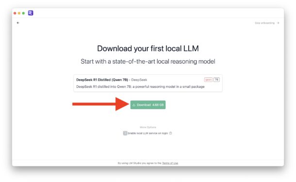 - На экране загрузки первой локальной модели нажмите зелёную кнопку «Download» (по желанию, снимите галочку с «Enable local LLM service on login», если не хотите, чтобы фоновый процесс для DeepSeek запускался при каждой загрузке системы).