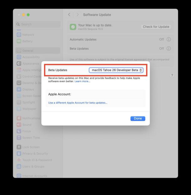 - В списке доступных бета-обновлений выберите «MacOS Tahoe 26 Developer Beta» (если этого пункта нет, закройте и снова откройте «Системные настройки» — возможно, текущий Apple ID не зарегистрирован в программе разработчика).